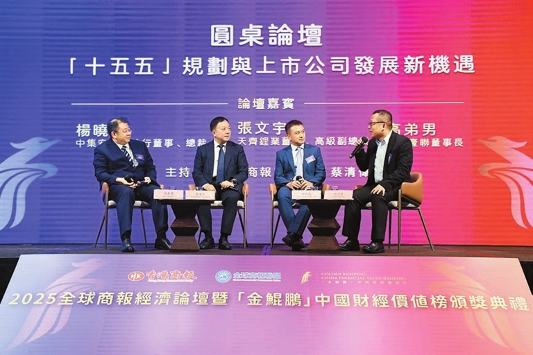 (左起)楊曉虎、張文宇、高弟男和蔡清偉(主持人),在圓桌論壇環節探討「十五五」規劃與上市公司發展新機遇。