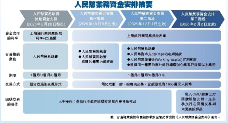 第二階段,由12月1日起,特定人民幣資本支出(Capex)及營運資金(Working capital)定期貸款將納入合資格業務範圍,大幅增加參加行及海外機構運用人民幣業務資金安排的應用場景,為銀行提供較可預測及穩定的人民幣資金成本渠道。