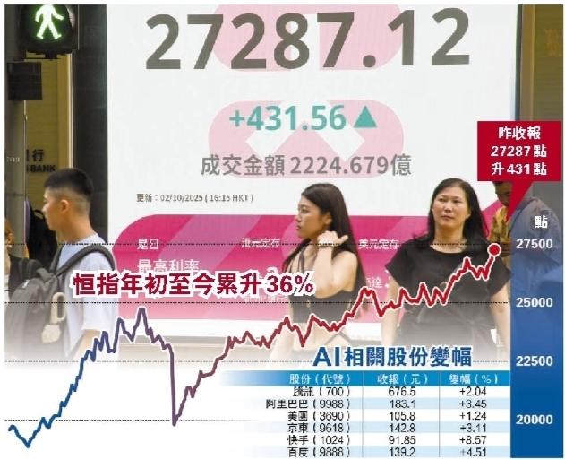當日盤面上,AI板塊表現亮麗,阿里巴巴(9988)被大行唱好,收升逾3%,報183.1元;快手(1024)升逾8%,報91.85元。其他科技股造好,騰訊(700)升13.5元或2%,報676.5元;美團(3690)升逾1%,報105.8元;京東(9618)升3%,報142.8元。