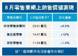 8月零售業總銷貨價值中,網上銷售佔8.4%,相關銷售價值臨時估計為25.5億元,按年升8.9%。首8個月合計升3%。