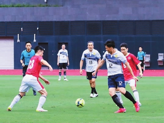 【香港商報訊】記者萬家成報道:特區政府足球隊和立法會足球隊昨日在啟德青年運動場舉行友誼賽,行政長官李家超和立法會主席梁君彥主持開球禮。昨日雖然三號風球懸掛,但無損兩隊球員的拼勁和熱誠,比賽最終由政府隊以2比1勝出。