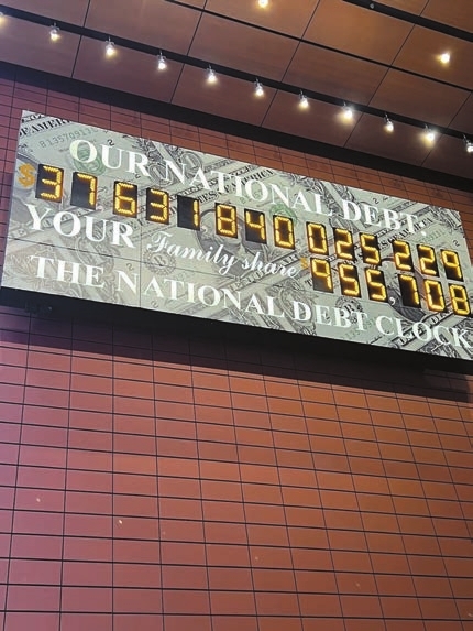 在紐約的國債鐘顥示,美國公債已升至37.6萬億美元。