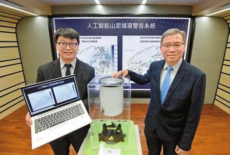 土力工程處長張偉文(右)和高級土力工程師朱琦康(左)介紹自主研發的第五代人工智能山泥傾瀉警告系統。記者 崔俊良攝