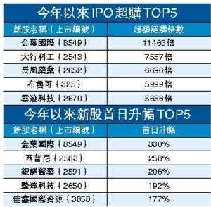 事實上,不少新股表現亦相當突出。如超購王金葉國際(8549),該股獲超額認購多達11463倍,上市首日升幅高達330%,是今年以來新股首日升幅榜冠軍。