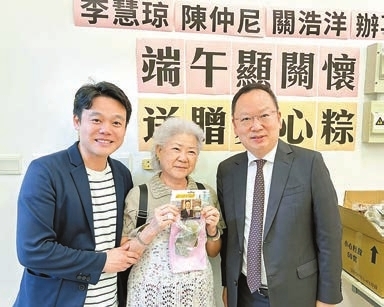 陳仲尼(右)與區議員關浩洋(左)參加端午節派糭活動,向街坊派送糭子。