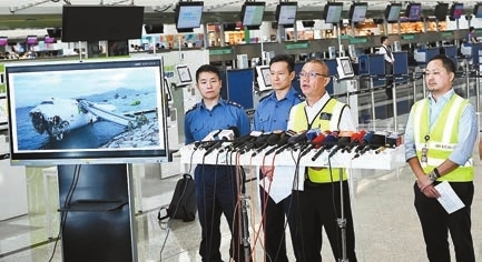 消防處助理署長(新界南)于文陽表示,昨日凌晨3時55分消防接到確實位置在機場北下水點附近,涉及一架阿聯酋航空貨機,消防員2分鐘後趕到現場展開救援,在現場看見一架飛機機身斷開兩截,在海上載浮載沉,4名機組人員在打開的機倉門等待救援,消防員隨即協助4人用逃生滑梯離開機艙,並得知一輛巡邏車墮海,消防員展開救援,在北跑道的500米範圍內搜索。