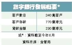 截至2025年6月,數字銀行的客戶數目340萬客戶、其客戶存款約770億港元及貸款金額290億港元。換言之,現時本港數字銀行的客戶,平均每名客戶存款22647元。