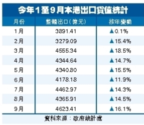 【香港商報訊】記者鍾俠報道:政府統計處昨日公布,繼8月出口貨值升14.5%後,9月商品出口貨值為4623億元,按年升16.1%,高於市場預期升15.4%。同時,繼8進口貨值升11.5%後,9月商品進口貨值為5125億元,按年升13.6%,市場預期升13.5%。9月錄得有形貿易逆差502億元,相等於商品進口貨值的9.8%。