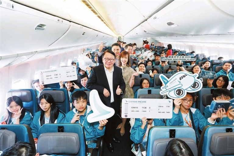 【香港商報訊】記者葉家亨、鍾柏汶報道:國泰航空「飛躍理想計劃」昨日舉辦「空中之旅」項目,讓約180名參與「共創明『Teen』計劃」的學員及來自循道衛理觀塘社會服務處的基層學生乘搭飛機,在香港上空翱翔約90分鐘。署理行政長官陳國基和國泰顧客及商務總裁劉凱詩出席項目啟動儀式,一同體驗飛行樂趣。
