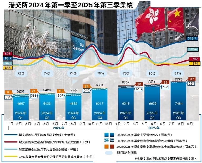 第三季,港交所收入和其他收益錄得77.75億元,按年升44.7%;主要業務收入74.84億元,增長54.2%,主因現貨市場成交量創新高,帶動交易及結算費上升。不過,其投資收益淨額下跌49.9%至2.54億元,主要因外部投資組合的公平值收益減少,以及公司內部資金投資回報下滑。除息稅折舊及攤銷前盈利(EBITDA)按年上升58.6%至62.25億元;EBITDA利潤率亦按年升7個百分點至81%。