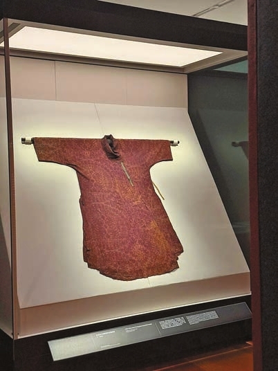 展覽按時序劃分為五個單元,引領觀眾漫步三千年絲綢藝術長河。隋唐時期,中國社會、經濟和文化發展進入了巔峰時期,與歐亞大陸及東南亞地區的來往愈加頻繁,商品經由陸上與海上絲綢之路遠銷海外。作為絲綢之路的黃金時期,這時絲織品展現了中外文化交融的特色。展品「紫綾地大團窠聯珠對獅紋袍」是這時期的代表作,袍服採用當時盛行的大團窠聯珠紋,融合了中原傳統的花卉意象與來自西域的聯珠團窠紋樣,並有充滿異域色彩的帶翼雄獅圖案。此袍由約40塊綾面料巧妙拼縫而成,製衣者在節省用料與保持外觀完整之間取得平衡,展現了唐代工匠的高超技藝與智慧,也是唐代絲織工藝繁盛的證明。明代絲綢則展現出另一番風貌,「藍色紗繡鬥牛紋褂」代表了明代刺繡藝術的極高水平。服飾採用精密的納紗繡工藝,工匠以方格紗為底料,嚴格按照格數進行刺繡,每平方厘米的針數可達數百,其精細程度令人嘆為觀止。衣上飾有三隻龍形牛角神獸「鬥牛」,在明代,飾有鬥牛紋的袍服是皇帝作為特殊恩賞的服裝,代表受賞賜者深獲恩寵,身份尊貴。此褂的衣料應在江南地區製作,之後可能通過高原絲綢之路輸入西藏地區,並按當地傳統服裝樣式製成,成為僧人或貴族在重要場合穿着的禮服,是漢藏文化交流的重要見證。