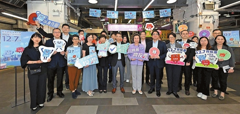 【香港商報訊】記者萬家成報道:公務員事務局局長楊何蓓茵昨日率領局內高層人員到駱克道市政大廈,向部門派駐分區辦事處和場地的前線公務員宣傳12月7日舉行的立法會選舉,號召同事踴躍投票、支持選舉。他們亦向市政大廈街市商販宣傳立法會選舉。