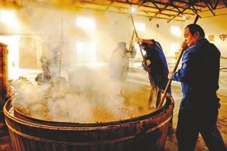 11月8日,走進河南省駐馬店市新蔡縣蔡洪坊酒業生產車間,現場蒸汽升騰,酒香彌漫。工人們各司其職,忙着拌料、攤晾、上甑、蒸煮、取酒……現場一派忙碌景象。宋超喜