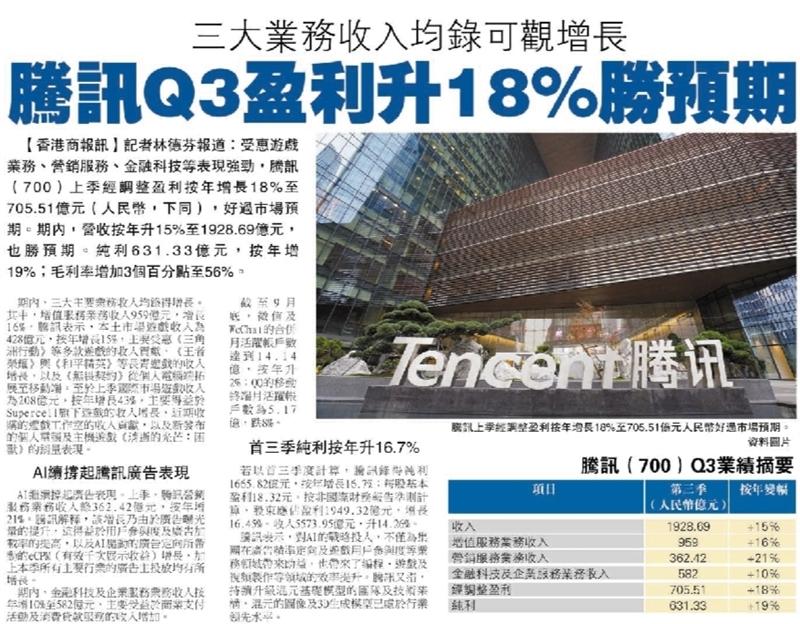 騰訊Q3盈利升18%勝預期