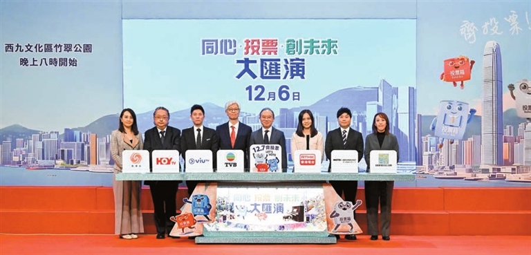 【香港商報訊】記者周偉立報道:為進一步提升選舉氣氛及社會關注度,呼籲全港選民在12月7日立法會換屆選舉投票日踴躍投票,特區政府將於12月6日晚上8時至10時在西九文化區竹翠公園舉行大型戶外綜藝晚會「同心.投票.創未來」大匯演。大匯演的門票將免費派發,具體安排稍後公布,而當晚的表演將會由本港7間電子傳媒共同作現場聯播。