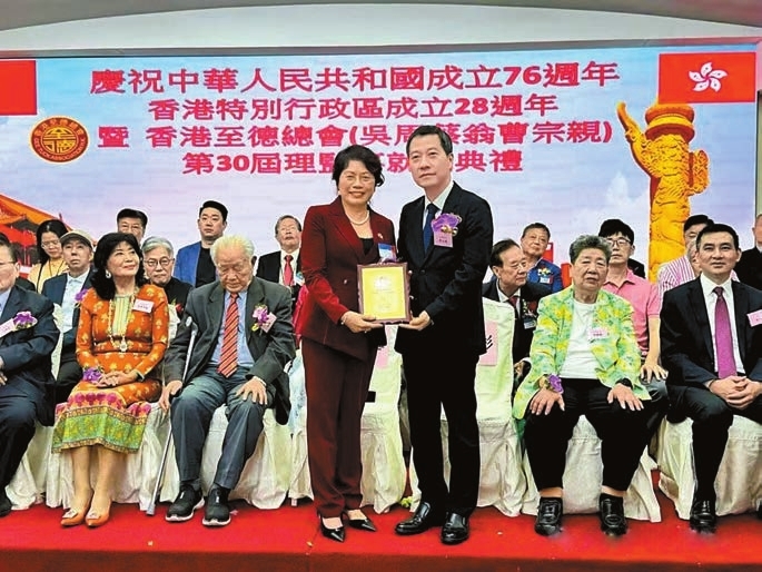 【香港商報訊】11月1日晚,英皇道668號富港酒家張燈結彩、喜氣洋洋。在慶祝中華人民共和國成立76周年、香港特別行政區成立28周年的喜慶氛圍中,香港至德總會(吳、周、蔡、翁、曹五姓宗親)第三十屆理監事會就職典禮隆重舉行,500多位嘉賓宗親歡聚一堂,共賀盛事。