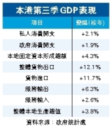【香港商報訊】記者鄺偉軒報道:政府統計處昨日公布,本港第三季度實質本地生產總值按年增長3.8%,較第二季的3.1%加快0.7個百分點,與早前公布的預估相若;首三季累計則按年增長3.3%。與此同時,港府將香港全年經濟增長預測由8月覆檢時的2%至3%上調至3.2%。