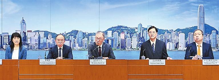 選舉管理委員會主席陸啟康(中)與政府政制及內地事務局局長曾國衞(左二)等出席記者會 ,簡介立法會換屆選舉的投票安排。中新社
