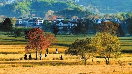 烏桕樹紅黃交織,與古村落、梯田稻浪相映成趣。汪澄攝