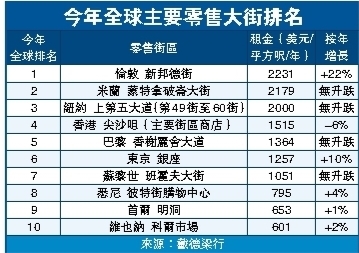 在亞太十大最昂貴零售大街排行榜中,香港獨佔三位(尖沙咀、銅鑼灣及中環),力壓日本東京大板、韓國首爾及澳洲悉尼;而且一眾大中華區城市中,只有香港上榜。