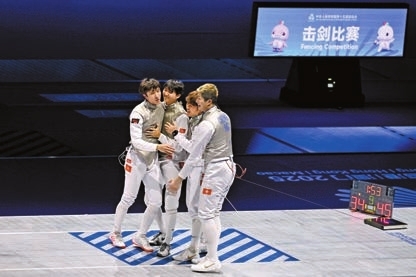 香港男子花劍隊昨日在團體賽決賽中擊敗福建隊,勇奪港隊全運史上首面劍擊金牌。中新社