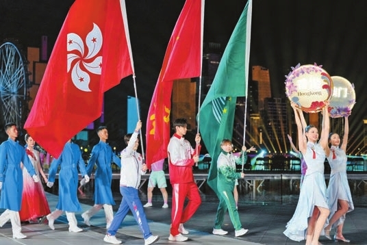 ▼廣東、香港和澳門體育代表團代表在閉幕式入場儀式上共同入場。新華社