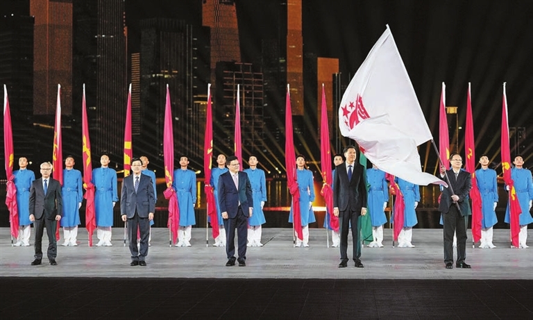 ?昨晚十五運會閉幕式上舉行全運會會旗交接儀式。 政府新聞處圖片