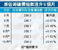 差估署10月私人住宅售價指數報294.3點,按月上升0. 41%,連升5個月。 資料圖片