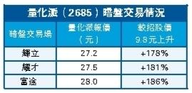 【香港商報訊】記者鍾俠報道:內地消費電商平台「羊小咩」母企量化派(2685)今日上市,昨日收市後設有暗盤,以上限9.8元定價的量化派,綜合三大暗盤場,曾在輝立暗盤場高見49.92元,高定價4.09倍,以一手500股計,成功認購量化派的投資者,每手最多賺20060元。最終三大暗盤收升約1.8倍,報27.2至28元,每手盈利8700至9100元。