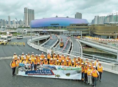 公路及鐵路國際會議考察團與路政署中九龍幹線工程團隊聽取項目介紹後在啟德地下隧道前合照。政府新聞處
