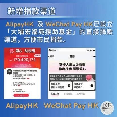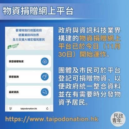 另外,財政司副司長黃偉綸表示,物資捐贈網上平台(https://www.taipodonation.hk)已開始運作,團體及市民可於平台登記可捐贈物資,以便政府統一分發物資予居民。黃偉綸昨日在社交媒體表示,捐款渠道方面,AlipayHK及WeChat Pay HK已設立「大埔宏福苑援助基金」的直接捐款渠道,方便市民捐款。