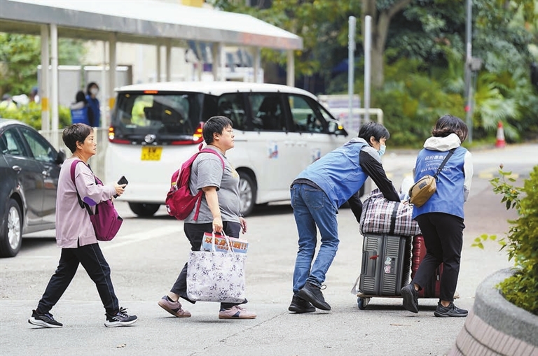 宏志閣居民在政府人員協助下回家取回個人物品。 中通社