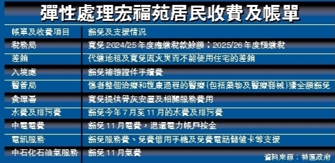 政府發言人昨宣布,將寬免大埔宏福苑受影響業主及居民2024/25課稅年度的應繳稅款餘額,以及2025/26課稅年度的應繳稅款。換言之,他們毋須繳交就2024/25課稅年度發出的稅單。政府亦會為受影響業主及居民代繳地租,以及寬免因火災而不能使用住宅的差餉。
