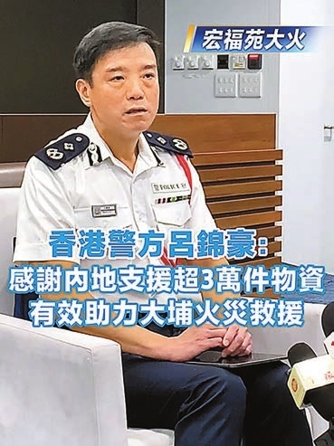 【香港商報訊】記者李銘欣報道:大埔宏福苑火災已過去10來天,香港警隊救援時深入仍未完全熄滅的火場,尋找失聯人士,搜集關鍵證據,他們所展現出的優秀而專業的能力,令人難忘和感懷。昨日,警隊行動處處長呂錦豪表示,截至前日(災後第9天),警方共出動1.4萬警力參與救援,在其他政府部門和機構協作下,已成功找到大部分失聯者。他特別感謝中央政府支援,迅速運來逾3萬件重要物資,減輕了前線人員的工作壓力。