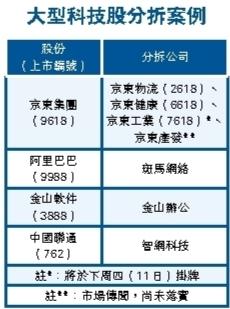 近年,隨着市況轉旺,不少科網及電訊巨企,紛紛已完成或部署分拆手上項目上市。其中,京東集團(9618)除已完成分拆京東物流(2618)、京東健康(6618)外,京東工業(7618)亦將於下周四(12月11日)上市。