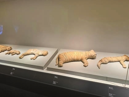 神聖動物墓地,數以百萬計的神聖動物木乃伊被埋葬於此,因此被列入2019與2020年世界十大考古新發現。在「薩卡拉的秘密」展區展示近40件新出土的文物,包括7件貓木乃伊。馬鋇洳說,古埃及人崇拜女神巴斯特,這位守護神與生育及保護家庭有關,並常以貓首人身形象出現。展品巴斯特雕像形象典型,「巴斯特右手持有樂器和儀式用具叉鈴,左手則手握飾有日輪和神首的盾形掛墜,手肘處還掛有籃子,因貓咪的生育能力強,有學者推測籃中應當裝有小貓。」信徒獻給女神的還願物除雕像外,還有貓木乃伊,薩卡拉作為巴斯特的主要崇拜中心,埋葬了數十萬隻貓木乃伊。馬鋇洳補充,為滿足信徒需要,神廟設有繁殖場飼養家貓,並由祭司將其製作成木乃伊。「許多貓咪未能活到成年,大約1歲左右就被殺害。因需求過於龐大,甚至存在造假現象,通過X光檢查,部分木乃伊內部僅存殘骨或填充了其他材料。」