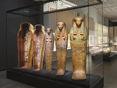 展覽展示了多套木乃伊棺槨,每個造型、紋樣均略有不同。(圖片由香港故宮文化博物館提供)