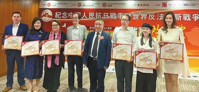 香港商報9月5日舉辦「紀念抗戰勝利80周年——國家安全知識挑戰賽啟動禮暨香港商報紀念專刊發布會」,李金會(右二)應邀出席並與嘉賓合照。