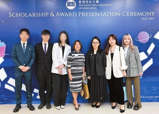 胡曾汝汶(左四)與曾在2022年獲香港恒生大學獎學金的學生在典禮上合影。