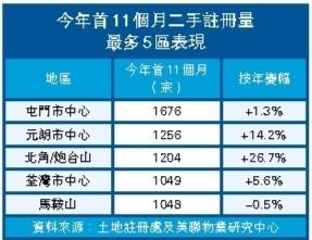 至於金額方面,於今年首11個月,北角及炮台山的二手註冊金額錄約為83.4億元,成為130區二手金額最高的區份,比起去年全年已高出約20.5%。西營盤的二手註冊金額亦較去年全年高出約15.1%。
