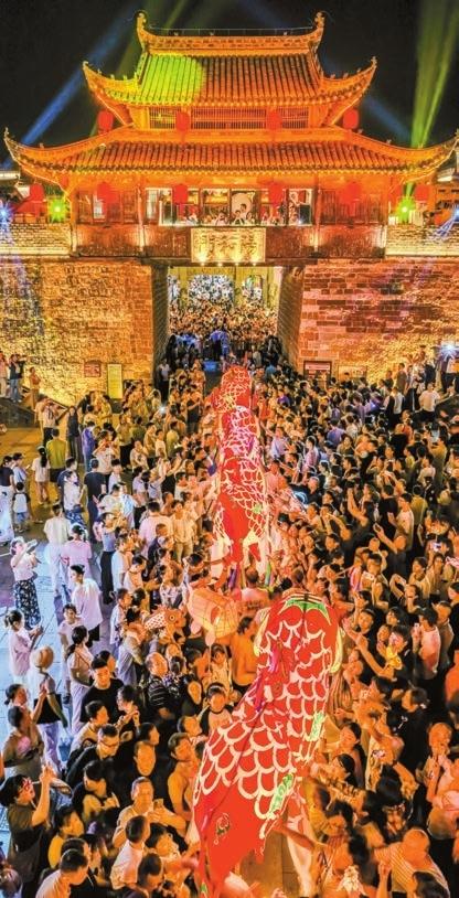 《徽州府有喜》沉浸式戲劇每晚在府衙上演,演員與遊客近距離互動,單場最高1800人觀看,累計帶動周邊吃住行等相關產業消費超1億元。魚燈巡遊轉入常態化,大魚在夜色中「擺尾」「昂首」,「太震撼了,燈光、鼓點、古建築完美融合,彷彿穿越回古代徽州繁華夜市。」澳門遊客葉青舉着相機全程跟拍。