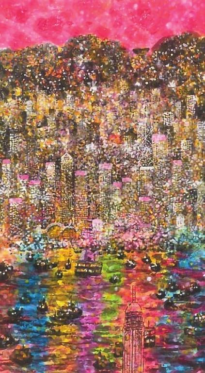 「夜。香港」以展覽名稱同名的作品《夜。香港》為重點展品,作品描繪了維港兩岸夜色,香江晚上,高樓大廈與船隻航行的燈光交映成輝,維港海面波光粼粼。作品墨韻沉着間蘊藏夜色特有的層次感,色彩斑斕中可見霓虹與萬家燈火的交織。香港知名地標在夜色中若隱若現,雖不刻意寫實,卻能讓觀者覓得熟悉的痕迹。