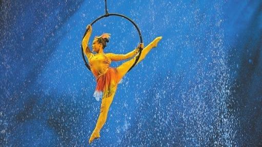 《水秀》演出現場,雜技演員在表演《水中吊環》節目。