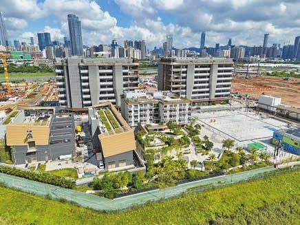 河套香港園區第一期8號濕實驗室大樓(後排左)、9號濕實驗室大樓(後排右)和人才公寓(前排右)已全面落成。孫東網誌圖片