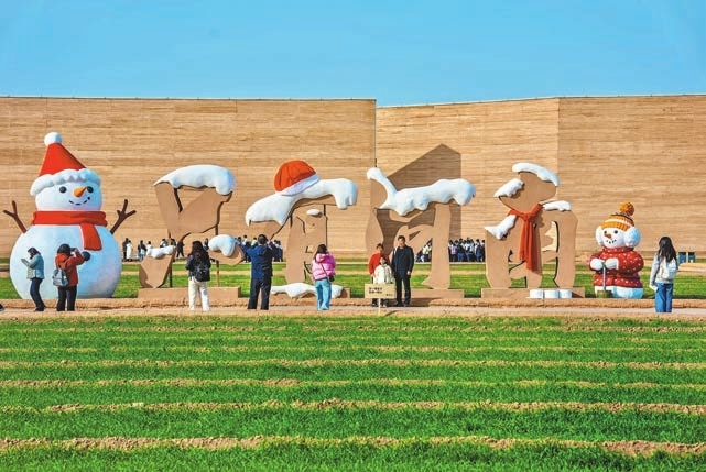 2025年大雪節氣的次日,來自河北的遊客李茵舉着手機,鏡頭裏定格着一片青綠麥田——湛藍天空下,兩隻雪人裹着紅圍巾、身着碎花襖,腳邊「壓」着雪白的「煤球」,圓滾滾的萌趣造型與麥田相映成趣。