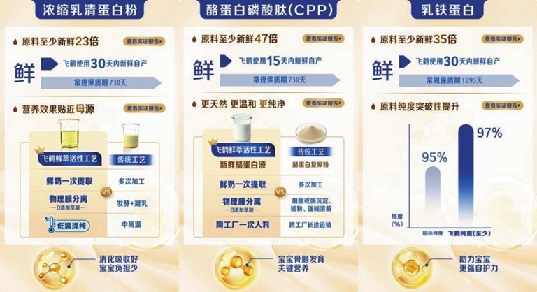 數據顯示,飛鶴自產乳清蛋白採用全球獨家納米級生物膜層析工藝,新鮮度達傳統原料的23倍;自產酪蛋白磷酸肽全程鮮萃零添加,新鮮度達傳統原料的47倍,實證吸收效果提升6.4倍。