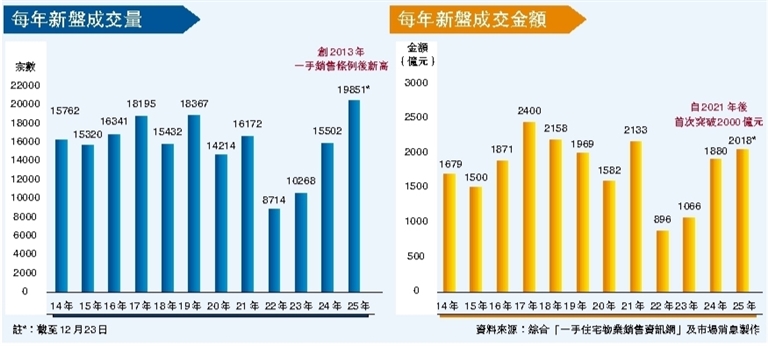 【香港商報訊】記者鍾俠報道:今年本港一手住宅市場相當暢旺,量額雙創新高。據美聯物業研究中心綜合「一手住宅物業銷售資訊網」資料及市場消息,今年以來(截至12月23日)一手成交量錄19851宗,較去年全年15502宗高出約28.1%,創2013年一手銷售條例後的新高;金額方面,一手樓市全年成交金額達2018億元,比去年全年的1880億元高出約7.3%,為自2021年首次突破2000億元水平後再創新高。