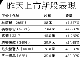 美聯股份昨開報8.21元,較招股價7.1元高15.6%,收報7.64元,較招股價高7.6%,全日成交1.23億元;每手300股計,一手帳面賺162元。迅策開報48.02元,與招股價48元基本持平,收報48.5元,較上市價48元,高出招股價1%,全日成交1.99億元;每手100股帳面賺50元。