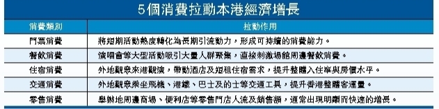 「大型演唱會對香港經濟有着直接的拉動作用。」董觀志表示,旅遊業是「食、住、行、遊、購、娛」等要素聯動的服務經濟,一場大型演唱會就是一次旅遊產業的大兵團作戰,透過五個層面的消費直接拉動香港經濟增長:一是門票消費;二是餐飲消費;三是住宿消費;四是交通消費;五是零售消費。