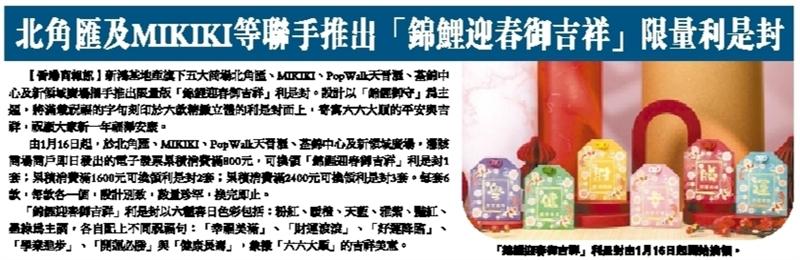 北角匯及MIKIKI等聯手推出「錦鯉迎春御吉祥」限量利是封